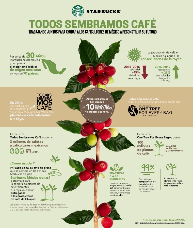 Gracias a Todos Sembramos Café, por cada bolsa de café en grano que se compre en las tiendas de toda la República Mexicana, del 9 de julio al 30 de septiembre, Starbucks México donará un porcentaje para la compra de plantas de café tolerantes a la roya, que serán entregadas a productores de café de Chiapas. Los clientes que así lo deseen, podrán realizar aportaciones directas en las tiendas de Starbucks México.