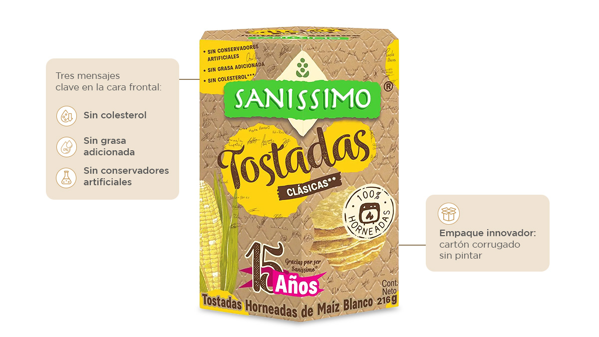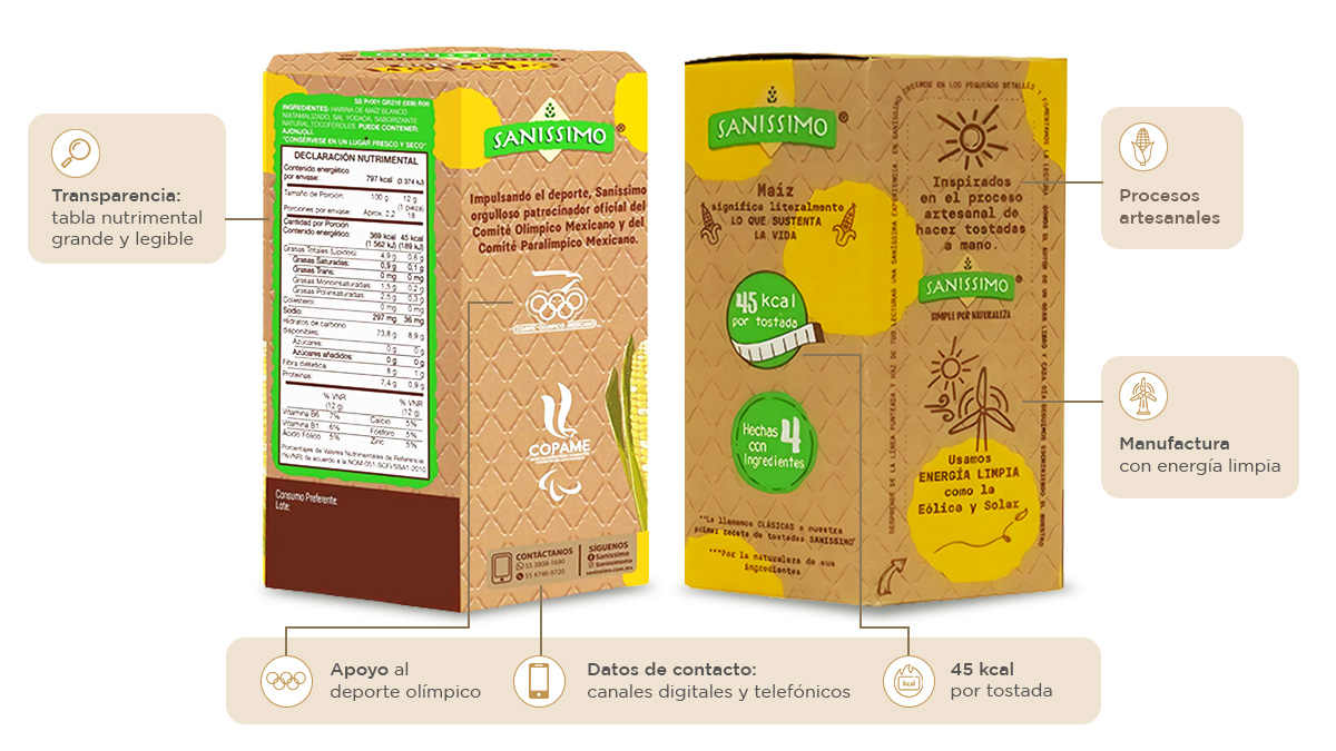 Las caras laterales amplían esta lógica con más información de salud, ambiental y social. Data complementa e impulsa la decisión de compra: