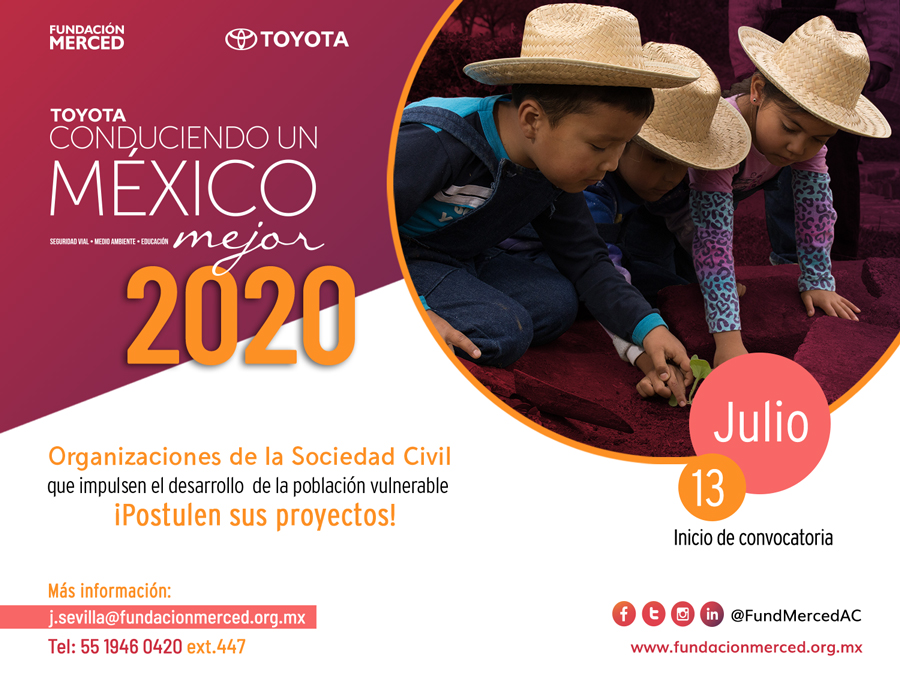 La convocatoria de “Toyota Conduciendo un México Mejor” se puede descargar en el siguiente enlace: https://fundacionmerced.org.mx/wp-content/uploads/2020/07/BasesToyota.pdf