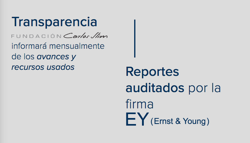 A diferencia del micrositio de Fundación Slim, la página del Fideicomiso sí hace públicos sus informes de auditorías, realizadas también por E&Y, además de sus estados financieros mensuales desde septiembre de 2017 y hasta junio de 2018.