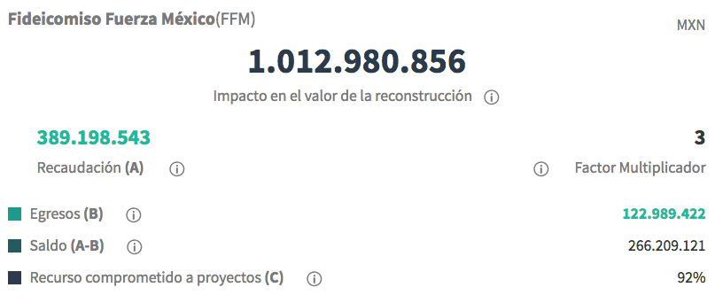 | Multiplicación | 2,467 mdp (aportación de 5 pesos por cada peso recaudado) | 1,013 mdp (coinversión de socios y aliados) | 38,000 mdp necesarios para la reconstrucción |