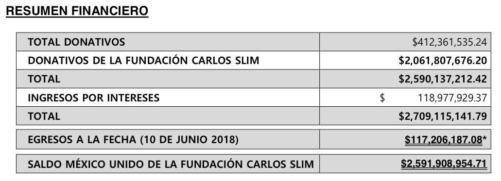 Fundación Carlos Slim habilitó su micrositio México Unido dentro de su página de internet para ofrecer la información correspondiente a los recursos recaudados. No obstante, ésta ha dejado de estar en el home del portal y no hay una pestaña que lleve directamente al micrositio, por lo que la vía más rápida para encontrar la información es teclear en el buscador: “México Unido Fundación Slim”.