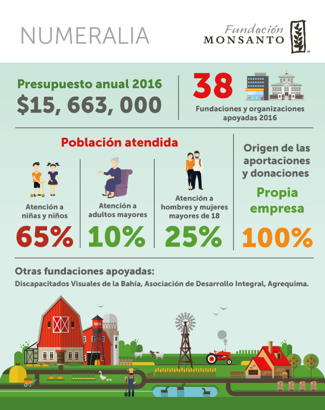 Las iniciativas de Monsanto a través de su fundación lograron beneficiar solo en un año a más de 40 mil personas en cerca de 20 comunidades. Trabajando específicamente en temas de seguridad alimentaria, fortalecimiento de comunidades y nutrición y acceso a servicios básicos, como agua drenaje o infraestructura.