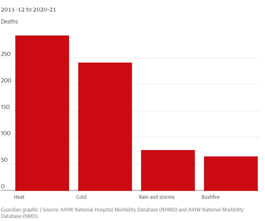 Recientemente, el Instituto Australiano de Salud y Bienestar lanzó un informe por primera vez que evalúa el impacto de cuatro eventos climáticos extremos en las hospitalizaciones y muertes desde 2012-13 hasta 2021-22, que incluyen el calor extremo, el frío extremo, los incendios forestales y las lluvias y tormentas.