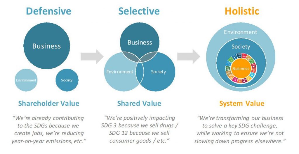 En una publicación reciente de Sustainable Brands, Geoff Kendall, cofundador de Future Fit, explicó cómo su equipo ha examinado cientos de informes de sostenibilidad en los últimos años. Encontraron que cuando se trata de abordar los Objetivos de Desarrollo Sostenible, su enfoque sigue uno de tres patrones comunes: Defensivo, Selectivo y Holístico.