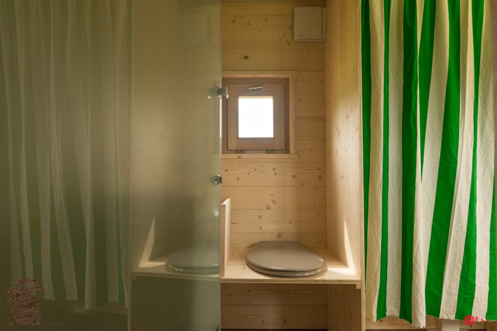 En el baño está el lavamanos, el inodoro y la regadera de compostaje con puerta de vidrio, todo cerrado con una puerta corredera que ahorra espacio.