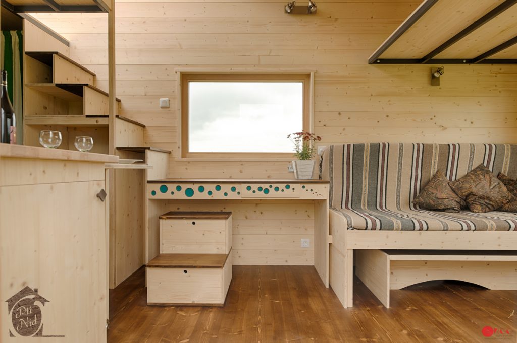 Junto al sofá hay una mesa pequeña que se integra como parte de la escalera: hay escalones de almacenamiento que se pueden mover justo debajo, y la mesa actúa como un rellano intermedio justo antes de que los escalones suban al altillo principal del dormitorio.