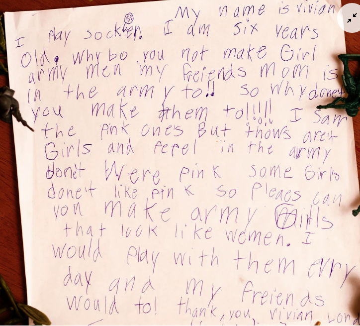 “¿Por qué no hacen militares que sean mujeres, ¡la amiga de mi mamá está en el ejército!”, escribió Vivian en una carta que Brittany le envió a tres compañías de juguetes. “¡¡¡¡¡Por qué no las hacen también!!!!!”.