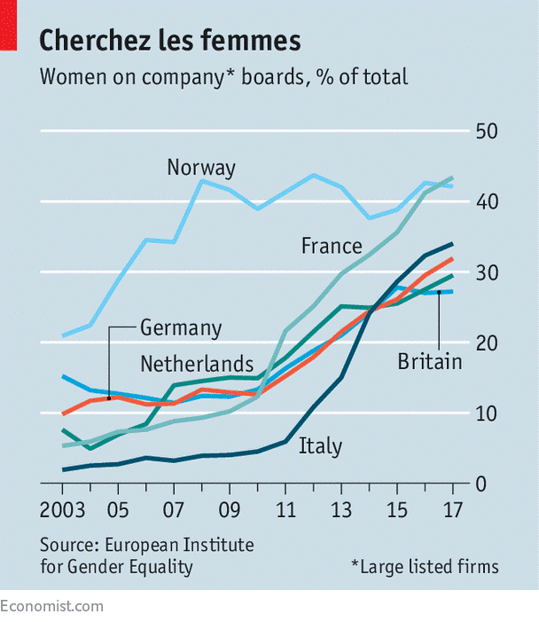 The Economist, en su edición del 17 de febrero del 2018 publica un artículo sobre laparticipación de las mujeres en los Consejos Directivos a tenor de los 10 años de la implantación de las cuotas en este sentido en Noruega, país más avanzado en el tema (The old-girls’ network: Ten years on from Norway’s quota for women on corporate boards). Para los interesados en el tema complace que el prestigioso semanario se preocupe del asunto, pero, como en sus otros artículos sobre responsabilidad social de la empresa, se regodea, con el típico cinismo británico (véase la primera parte del título: “La red de las señoras”, con sentido conspiratorio), de que lo que se opone a la libertad de acción por parte de las empresas no funcione como se espera. Pero siempre expresa una posición rigurosa, bien argumentada, lo que nos da una buena oportunidad de comentarla.