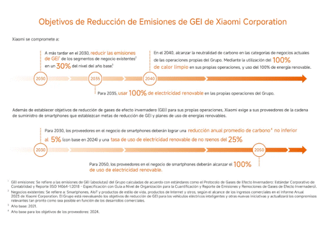 Además de establecer objetivos de reducción de gases de efecto invernadero (GEI) para sus propias operaciones, Xiaomi exige a sus proveedores de la cadena de suministro de smartphones que establezcan metas de reducción de GEI y planes de uso de energías renovables. Para 2030, estos proveedores deberán lograr una reducción anual promedio de carbono no inferior al 5% (con base en 2024) y un uso de electricidad renovable de al menos el 25%. Para 2050, deberán usar electricidad 100% renovable.