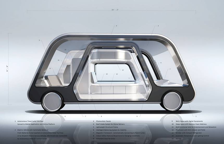Esta diseño conceptual es una nueva forma de hospitalidad combinada con el transporte, a través de una suite móvil sin conductor que ofrece servicio de transporte puerta a puerta entre el hogar y el destino del viajero, utilizando sistemas inteligentes y tecnología de conducción autónoma.